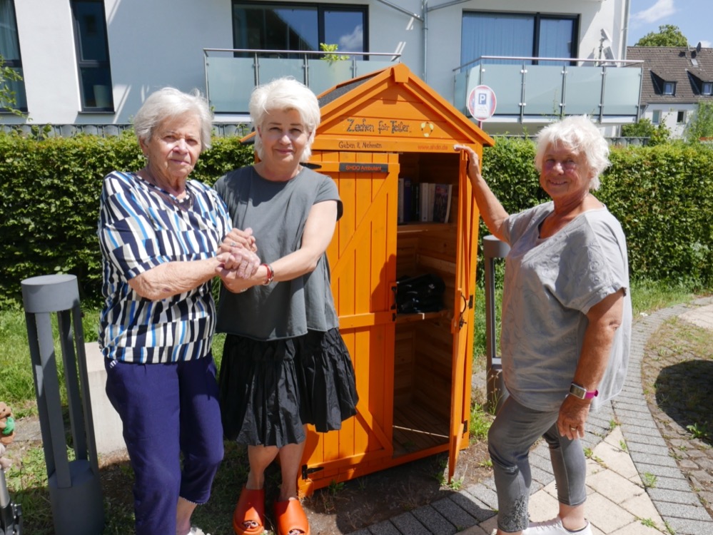 Mitarbeiter:innen der Städtischen Seniorenheime (SHDO) kümmern sich seit Anfang des Jahres um das Wohl der Mieter:innen des DOGEWO21-Seniorenhauses Sonnenhof. Sie haben sich aber auch zum Ziel gesetzt, den Sonnenhof zu einem zentralen Treffpunkt für Alt und Jung im Quartier zu entwickeln. Der Geben-und-Nehmen-Schrank ist ein Baustein in diesem Konzept.