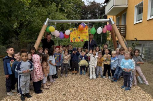 Mit einem großen „JUCHHU“ haben die Kinder von der Ev. Kita „Märchenland“ die neuen Schaukeln auf ihrem Außengelände in Beschlag genommen. Die Kinder und die Mitarbeiter:innen von der Ev. Kita „Märchenland“ in Kemminghausen freuen sich sehr über die Sparkassenspende von zwei neuen Schaukeln. Eine Schaukel ist in die Jahre gekommen und musste ausgetauscht werden, im Zuge dessen wurde für die U3 Kinder eine kleine Nestschaukel finanziert.