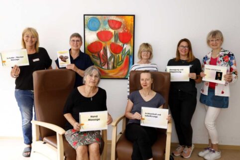 Das Foto zeigt von links sitzend: Fr. Fiedler (Gesundheitsberaterin GGB) , Fr. Klapprott ( Trainerin und Supervisorin). Von links stehend: Fr. Westenberger (AWO Tagespflege), Fr. Sellin (Seniorenbüro Innenstadt-West), Fr. Beckerling (AWO Tagespflege), Fr. Reinecke ( Koordinatorin Gesundheitsförderung beim TSC), Fr. Wedemeyer ( freiberufliche Referentin).