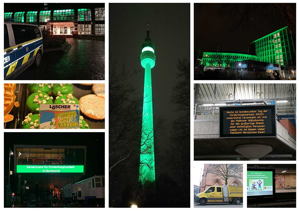 Die beiden Dienste hatten gemeinsam einiges in Bewegung gesetzt, um am 10. Februar, dem Tag der Kinderhospizarbeit, gemeinsam auf das Schicksal von Familien aufmerksam zu machen, in denen Kinder und Jugendliche mit lebensverkürzenden Erkrankungen leben, die mithilfe von Ehrenamtlichen im Alltag unterstützt und begleitet werden. Den Anfang machten am Donnerstag schon früh morgens die Bäckerei Löscher und die Dortmunder Stadtwerke (DSW21). Die DSW21 lieferte auf ihren Anzeigetafeln im Stadtbahnverkehr Informationen zur Kinderhospizarbeit, die Bäckerei verkaufte in ihren Filialen Berliner Ballen mit grünem Zuckerguss. Zeitgleich waren Hunderte Fahrzeuge der Taxi Dortmund eG, der Entsorgung Dortmund GmbH (EDG), der DEW21 und des Unternehmens Green IT in Dortmund unterwegs, die sich mit grünen Bändern geschmückt hatten und damit ihre Solidarität mit den betroffenen Familien bekundeten. Ebenfalls grün geschmückt hatte sich das Dortmunder Fair-Fashion-Label Pihani. Mit Einbruch der Dunkelheit gingen dann die Lichter an: Dortmund leuchtete grün! Am Florianturm im Westfalenpark, am Opernhaus, am Deutschen Fußballmuseum am Königswall, an der Zentrale der Dortmunder Energie- und Wasserversorgung GmbH (DEW21) am Günter-Samtlebe-Platz und sogar am Polizeipräsidium wurde mit grünem Licht sichtbar, wie sehr sich die Dortmunder Institutionen und Unternehmen mit dem Tag der Kinderhospizarbeit solidarisierten.
