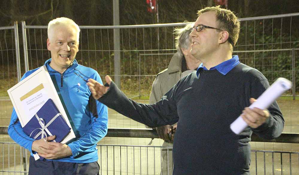 TSC Vorstandsvorsitzender Alexander Kiel (l.) richtet ehrende Worte an Uwe Kober (in blau).