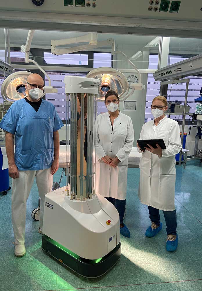 Seit neustem ist Pauli, ein UV-C Desinfektionsroboter, im Ambulanten Operationszentrum im St. Johannes Hospital anzutreffen. Das UV-C Desinfektionsgerät fährt einen Raum vollautomatisch ab und bestrahlt jede zu desinfizierende Oberfläche mit UV-Licht. Da die ausgesendete kurzweilige UV-C-Strahlung sehr energiereich ist, werden Viren und Bakterien in kurzer Zeit zuverlässig abgetötet.