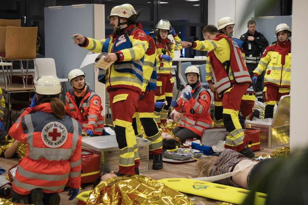Mehr als 120 ehren- und hauptamtliche Helfer:innen des DRK Dortmund aus dem Katastrophenschutz, der Sondereinsatzgruppe Rettungsdienst sowie Notfallsanitäter:innen der Ausbildungsjahre 2 und 3 übten gemeinsam mit dem Löschzug 25 der Freiwilligen Feuerwehr Dortmund die notfallmedizinische und betreuungsdienstliche Versorgung von 34 Patienten nach einer Amoklage an einer Schule. Der Alarm wurde am späten Nachmittag von der Leitstelle der Feuerwehr ausgelöst, und die Ehrenamtlichen fuhren aus dem gesamten Stadtgebiet zum Einsatzort an der Schleefstraße. Viele Verletzte, dargestellt von Notfalldarsteller:innen, hatten schwere Stichverletzungen oder waren psychisch belastet. Die Übung dauerte über drei Stunden und wurde von Oberbürgermeister Alexander Kalouti, Ordnungsdezernent Norbert Dahmen, dem diensthabenden Direktionsdienst Torsten Rose und DRK-Kreisgeschäftsführer Fred Weingardt begleitet. Kalouti dankte den Ehrenamtlichen für ihr Engagement als wichtigen Teil der Sicherheitsarchitektur, Weingardt lobte insbesondere die Leistungsfähigkeit der Helfer:innen: Bereits nach weniger als 60 Minuten waren über 80 Sanitäter:innen, Betreuer:innen, Logistiker:innen und Rettungsdienstmitarbeiter:innen vor Ort. Das DRK betont, dass Ehrenamt im Bevölkerungsschutz und im öffentlichen Rettungsdienst ein zentraler Bestandteil der nichtpolizeilichen Gefahrenabwehr ist und regelmäßiges Training unerlässlich, um Wissen zu festigen.