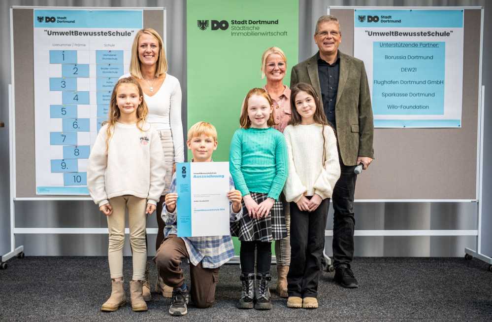 Die Grafen-Grundschule wurde beim Wettbewerb „UmweltBewussteSchule 2024“ als besonders engagierte Schule ausgezeichnet. Insgesamt haben 29 Dortmunder Schulen teilgenommen, die zehn Erstplatzierten erhielten im Rathaus Urkunden und Geldprämien von bis zu 2.000 Euro. Die ersten drei Plätze belegten die Grafen-Grundschule, die Gustav-Heinemann-Gesamtschule und die Regenbogen-Grundschule. Dortmunds Baudezernent Arnulf Rybicki würdigte die Kreativität, den Einsatz und das Verantwortungsbewusstsein der Schüler:innen und Lehrkräfte beim Umgang mit Energie, Wasser und Abfall. 2024 haben die teilnehmenden Schulen rund 86.800 Euro an Energie- und Wasserkosten eingespart und witterungsbereinigt den Verbrauch um etwa 492.000 Kilowattstunden Wärme, über 30.000 Kilowattstunden Strom und rund 170 Kubikmeter Wasser reduziert. In den vergangenen 13 Jahren summierten sich die Einsparungen auf rund 404.800 Euro. Die Grafen-Grundschule überzeugte mit zahlreichen Aktivitäten, darunter ein Hühner-Projekt, bei dem Kinder Verantwortung für Leih-Hühner übernahmen, sowie Workshops zu Recycling, erneuerbaren Energien, Biodiversität und gesunder Ernährung. Die Gustav-Heinemann-Gesamtschule integriert Umwelt- und Klimaschutz langfristig in den Schulalltag, beteiligt über 900 Schüler:innen am Energie- und Recycling-Wettbewerb und betreut eine selbstgebaute Aquaponik-Anlage. Die Regenbogen-Grundschule setzt auf nachhaltige Mobilität mit der Aktion „Zu Fuß zur Schule“ und das Projekt „Klopiloten“ für sparsamen Umgang mit Wasser, Seife und Papier. Sponsoren wie Borussia Dortmund, DEW21 und die Wilo-Foundation unterstützten die Schulen zusätzlich mit weiteren Preisen im Gesamtwert von 3.300 Euro.