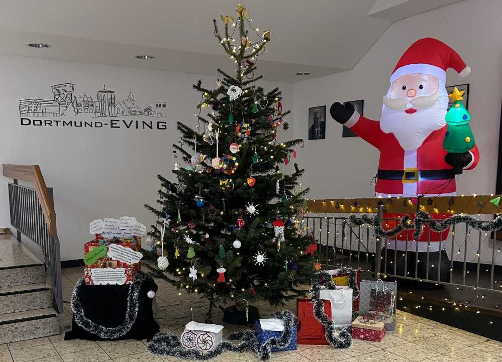 Der Weihnachtsbaum der Bezirksverwaltungsstelle Eving erstrahlt erneut hell und festlich geschmückt. Die OGS-Kinder der Herder-Grundschule, Elisabeth-Grundschule, Brechtener Grundschule, Graf-Konrad-Grundschule und Mosaik-Grundschule haben dafür liebevoll Baumschmuck gefertigt. Beim Schmücken des Baumes wurden zahlreiche Gespräche mit Besuchenden geführt, die zudem eine süße Aufmerksamkeit erhielten. Begleitend wurde eine neue Idee umgesetzt: Aus Weihnachtsbaumkugeln des Stadtbezirksmarketings Eving gestaltete Frau Giebisch, Mitglied der Lenkungsrunde, einen Adventskranz für den Sitzungssaal der Bezirksverwaltungsstelle. Außerdem steht in der Eingangshalle wieder die Weihnachtskiste mit dem Schmuck vom Vorjahr, der von Besuchenden mit nach Hause genommen werden darf und Freude bereiten soll. Der festlich geschmückte Baum wird die vorweihnachtliche Zeit im Stadtbezirk nun begleiten.