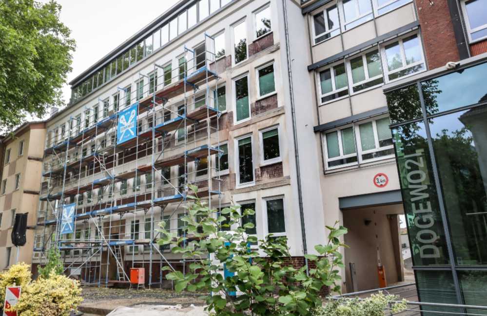 DOGEWO21 hat sich bereits 2022 entschieden, am traditionsreichen Standort in der Landgrafenstraße 77/79 in der südlichen Dortmunder Innenstadt zu bleiben und diesen zukunftsorientiert zu modernisieren. Die beiden Verwaltungsgebäude aus den 1950er-Jahren, in denen sich auch das zentrale Kundenzentrum befindet, werden seit Mai 2025 umfassend energetisch saniert, um sie nachhaltig für die kommenden Jahrzehnte aufzustellen. Ziel der Maßnahmen ist es, den Energiebedarf deutlich zu senken und die CO₂-Emissionen langfristig zu reduzieren. Dazu werden die Gebäude vollständig auf regenerative Energiequellen umgestellt. Geplant sind unter anderem der Einbau von Luftwärmepumpen, eine neue Photovoltaikanlage mit Dachbegrünung sowie moderne Dämmung, Lüftungs- und Sonnenschutztechnik. Auch die Flachdächer werden erneuert. Die Fertigstellung der Bauarbeiten ist für das erste Quartal 2026 vorgesehen. In Vorbereitung auf die Sanierung wurden Baustelleneinrichtungen geschaffen und Stellplätze vor den Gebäuden gesperrt, wobei der Bürgersteig weiterhin begehbar bleibt – im Bereich von Haus 77 jedoch überbaut wird. Der Zugang zum Kundenzentrum bleibt während der gesamten Bauzeit uneingeschränkt möglich. Mit dieser Investition in einen klimagerechten Unternehmenssitz bekennt sich DOGEWO21 klar zur Nachhaltigkeit, zum verantwortungsvollen Umgang mit Bestandsimmobilien und zur Verlässlichkeit gegenüber Mieterinnen und Mietern.