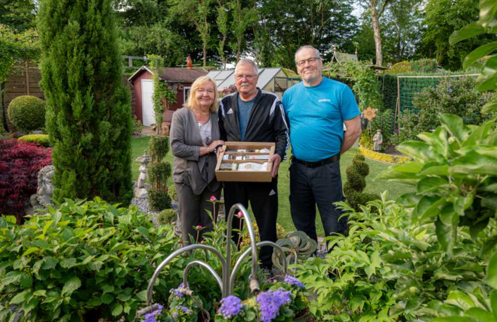 Das Bild zeigt: Heinrich (Mitte) und Jutta Klosowski (links, in ihrem selbst gestalteten Mietergarten an der Buschstraße in Dortmund-Huckarde, den sie seit 29 Jahren mit viel Liebe zum Detail pflegen. Vonovia Objektbetreuer Andreas Horst (rechts) überreichte ihnen einen Präsentpaket.