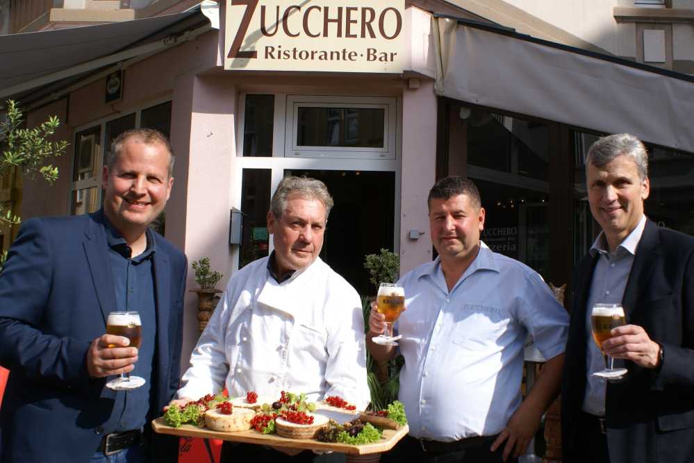 Auf dem Bild zu sehen: Andreas Nolte (li., Dortmunder Brauereien) und Thomas Schneider (re., Geschäftsführer der Dortmunder Brauereien) gratulieren dem Zucchero-Gastronomen Bajram Zeqiri (2.v.r.) und seinem Küchenchef Fabio Bardella (2.v.l.) zum sonnigen Jubiläum.