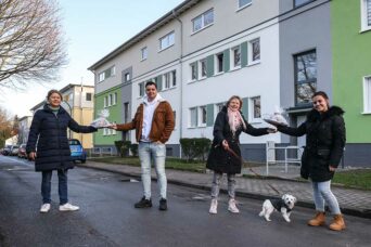 DOGEWO21 begrüßte die ersten Neumieter:innen und überreichte ihnen Brot und Salz als traditionelles Geschenk zum Einzug. Seit November 2021 sind die neu gebauten Dachgeschosswohnungen in den Häusern Massener Weg 207 bis 223 in Körne bezugsfertig. Rund 90 % der achtzehn Wohnungen, entstanden durch Aufstockung der Bestandshäuser, sind inzwischen vermietet.