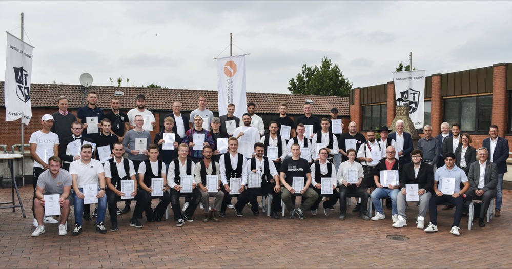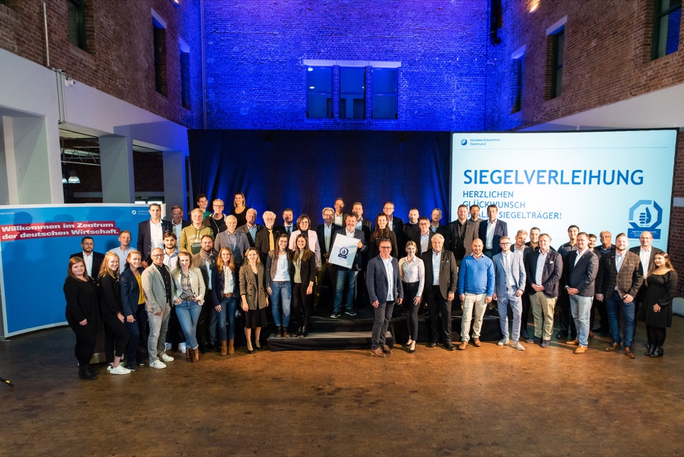 Für vorbildliche Ausbildung junger Menschen sowie besonders erfolgreiche Nachwuchsgewinnung und Fachkräftebindung erhielten 25 Unternehmen aus dem Kammerbezirk Dortmund am vorigen Freitag das Siegel für Ausbildungsqualität. Fünf Unternehmen kommen aus Dortmund. HWK-Vize-Präsidenten Kerstin Feix (Arbeitgeber) und Marc Giering (Arbeitnehmer) überreichten mit Staatssekretär Matthias Heidmeier die Auszeichnungen, passend zum bundesweiten Tag des Handwerks.