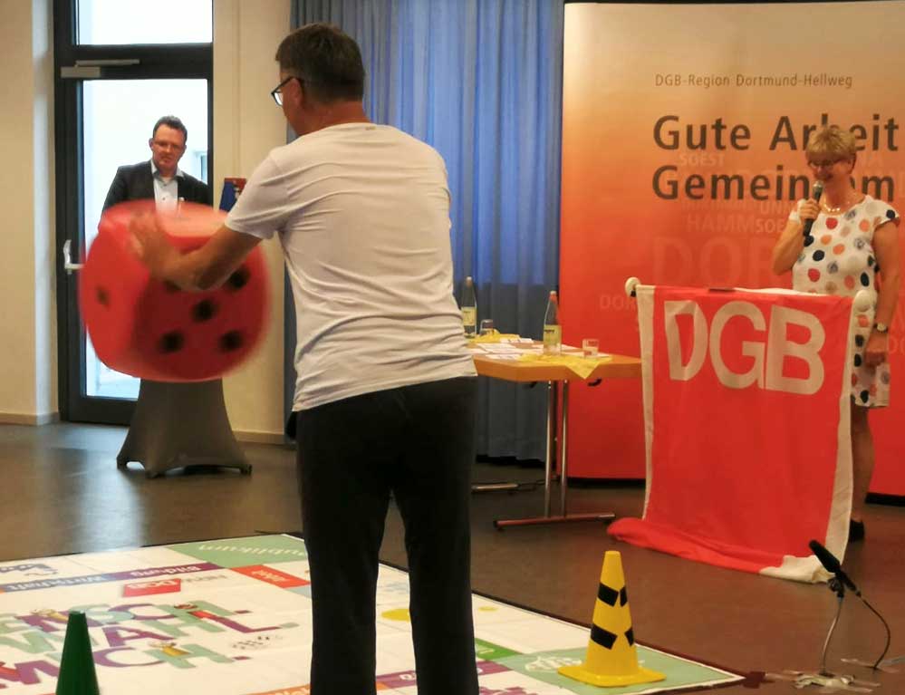 Statt immer wieder aufs Neue die altbekannte Podiumsdiskussion zu politischen Wahlen zu veranstalten, kommunizierte der DGB Dortmund seine Forderungen jetzt im Reinoldinum in einer neuen Form. „Mensch.Wähl.Mich.“ ist der Titel des Spiels, bei dem die OB-Kandidat*innen Daniela Schneckenburger (Bündnis 90/Die Grünen), Thomas Westphal (SPD), Dr. Andreas Hollstein (CDU) und Utz Kowalewski (Die Linke) – der FDP Kandidat ließ sich krankheitsbedingt entschuldigen – die ihnen gestellten Fragen spontan beantworten mussten. Je nachdem welches Feld sie im Spiel erreichten, mussten Sie Fragen zu den DGB Forderungen in den Bereichen Arbeit, Wohnen, Bildung, Klima, Soziales, Mobilität und Demokratie beantworten. Auch die Zuschauer konnten sich mit Fragen einbringen.