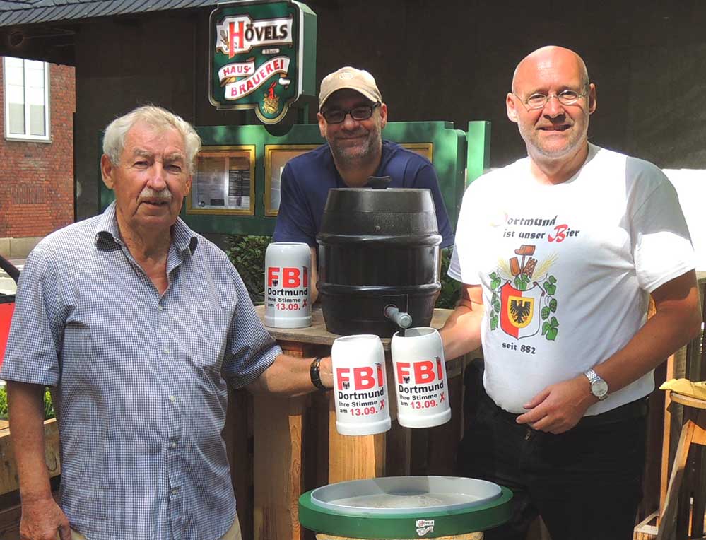 Coronabedingt hat Detlef Münch als Oberbürgermeister-Kandidat der Freien Bürger Initiative FBI zur Kommunalwahl am 13. September jedoch lieber nur mit noch problemlos erlaubten 10 FBI-Wahlunterstützern dazu aus Anlass des Tages des Dortmunder Bieres einen Fassanstich mit dem Trinkspruch „Dortmund ist unser Bier“ u.a. mit dem ehemaligen Dortmunder KRONEN-Bierbrauer Peter Nicolai und Bier-Sommelier Matthias Winter (s. Foto) zelebriert.