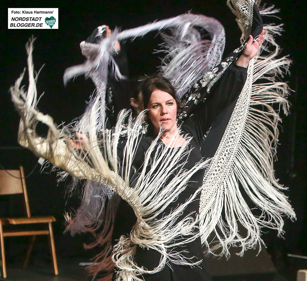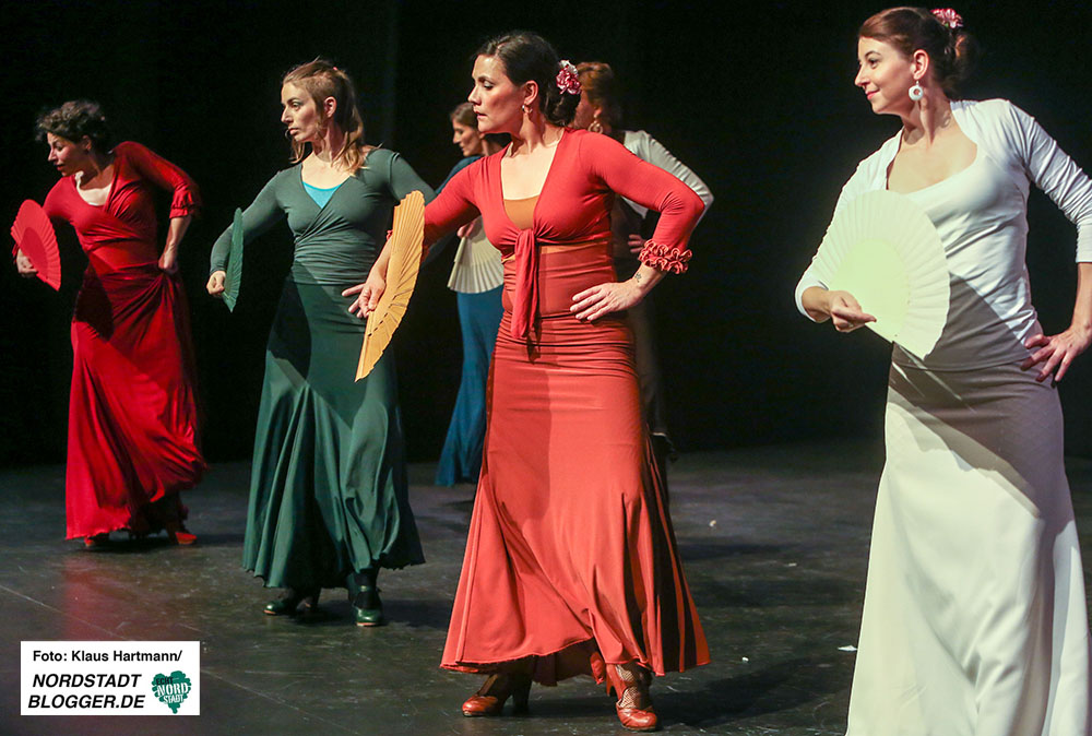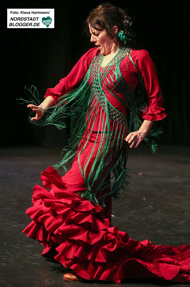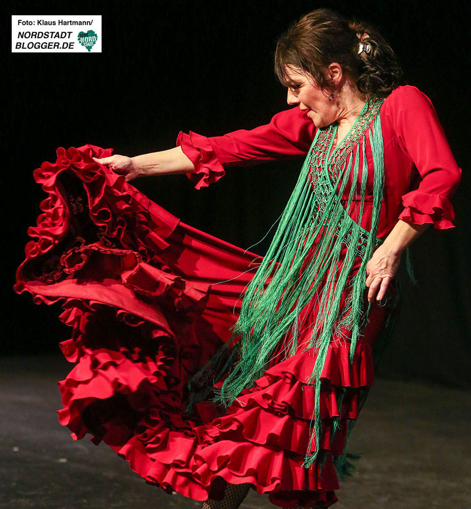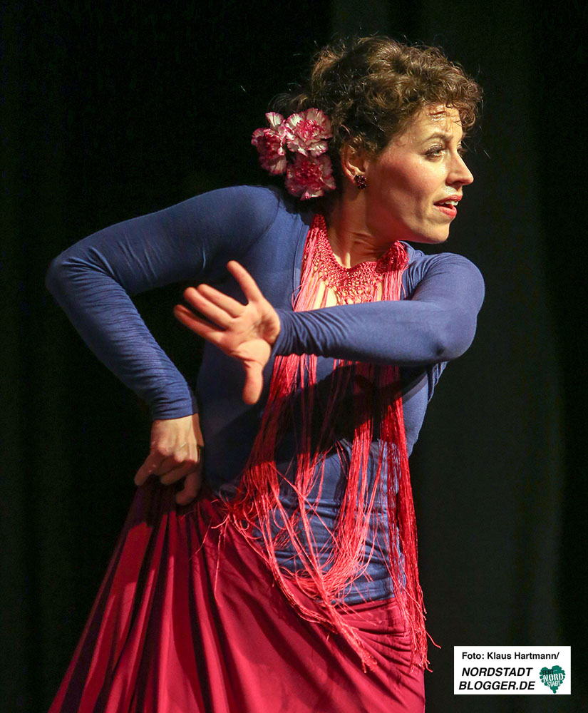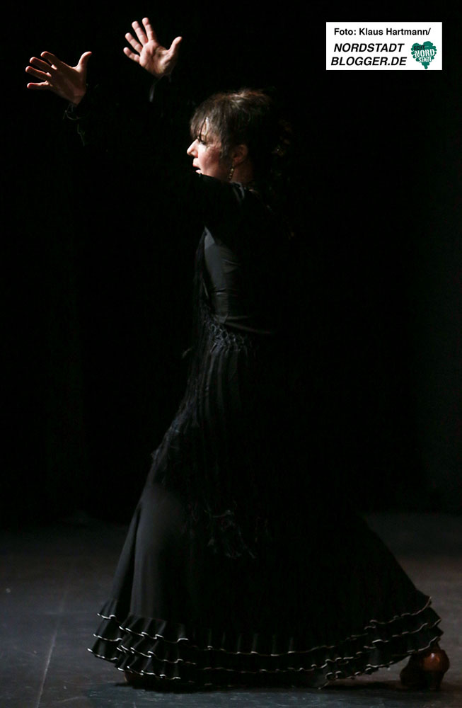 Mit Tücher, Fächern, Stöcken und Schleppen, den sogenannten „Complementarios, präsentierten sie eine tolle Performance auf die Bühne des Theaters in der Nordstadt. Im zweiten Teil der, weit über zwei Stunden dauernden, Veranstaltung zeigt die Formation Caleidoscopio Flamenco mit La Martina selbst, dem Gitarristen David Rey Delgado und der Sängerin Yota Barón klassischen Flamenco.