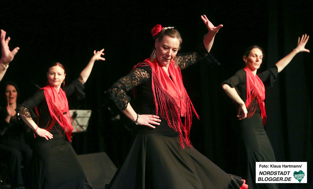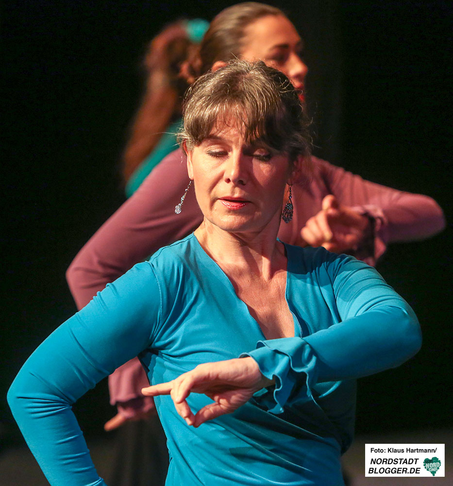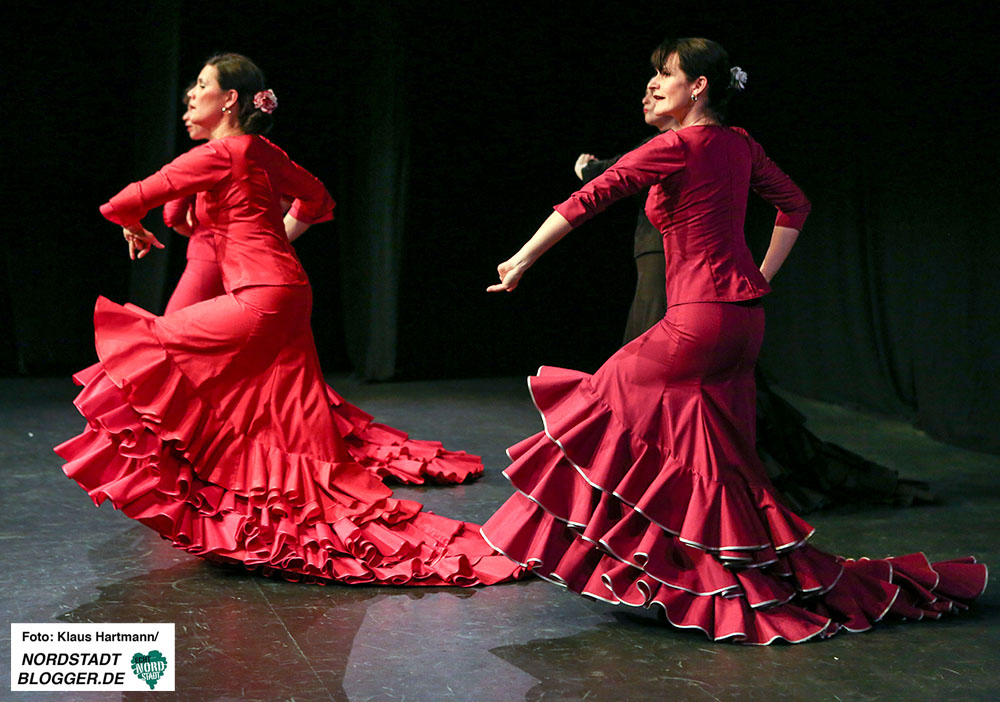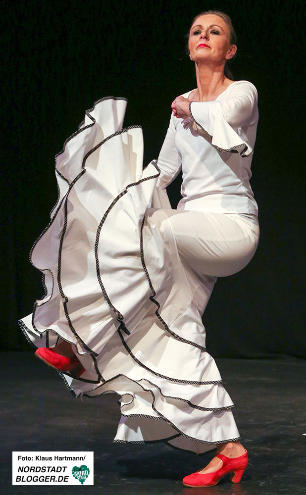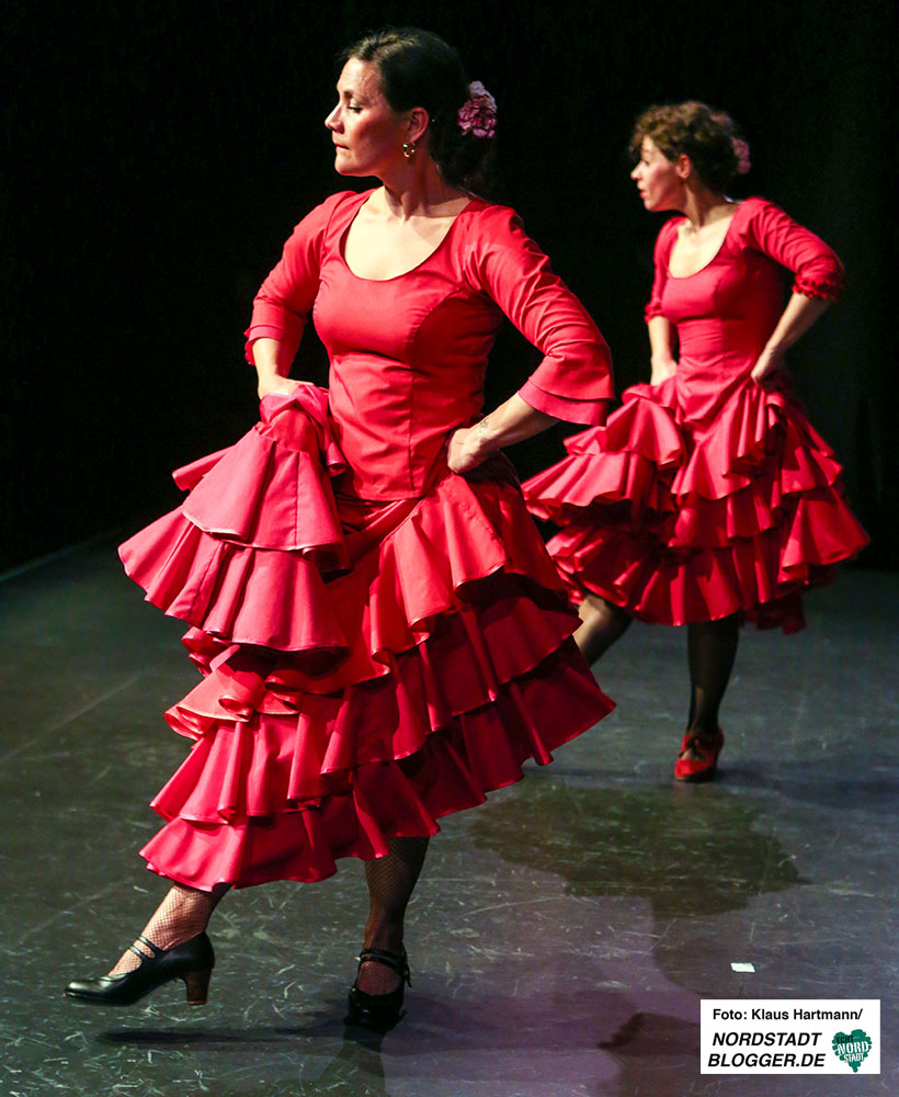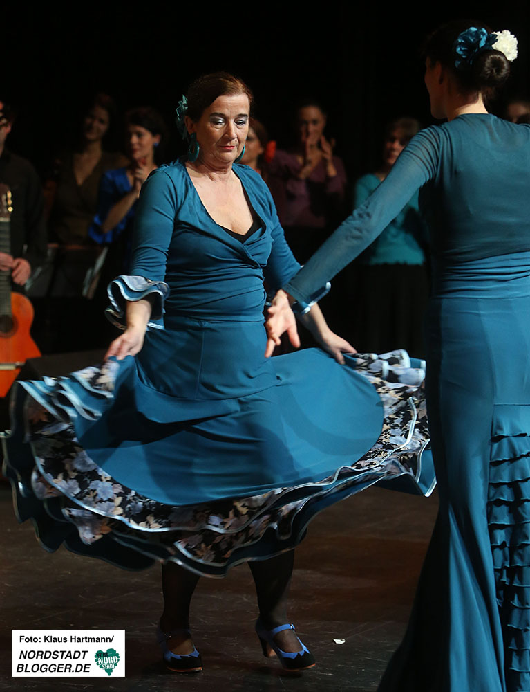 Mit Tücher, Fächern, Stöcken und Schleppen, den sogenannten „Complementarios, präsentierten sie eine tolle Performance auf die Bühne des Theaters in der Nordstadt. Im zweiten Teil der, weit über zwei Stunden dauernden, Veranstaltung zeigt die Formation Caleidoscopio Flamenco mit La Martina selbst, dem Gitarristen David Rey Delgado und der Sängerin Yota Barón klassischen Flamenco.