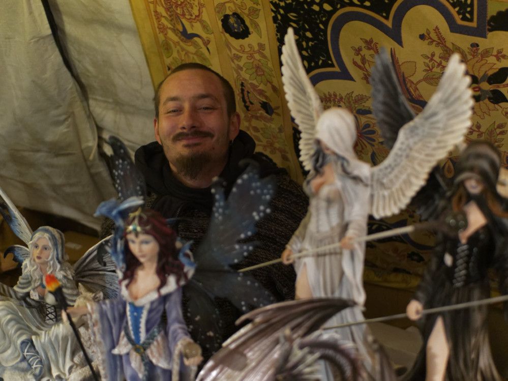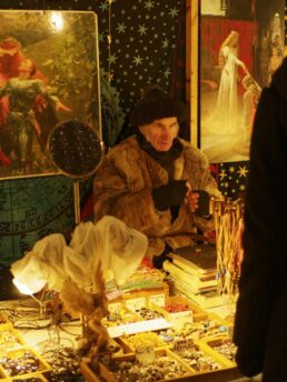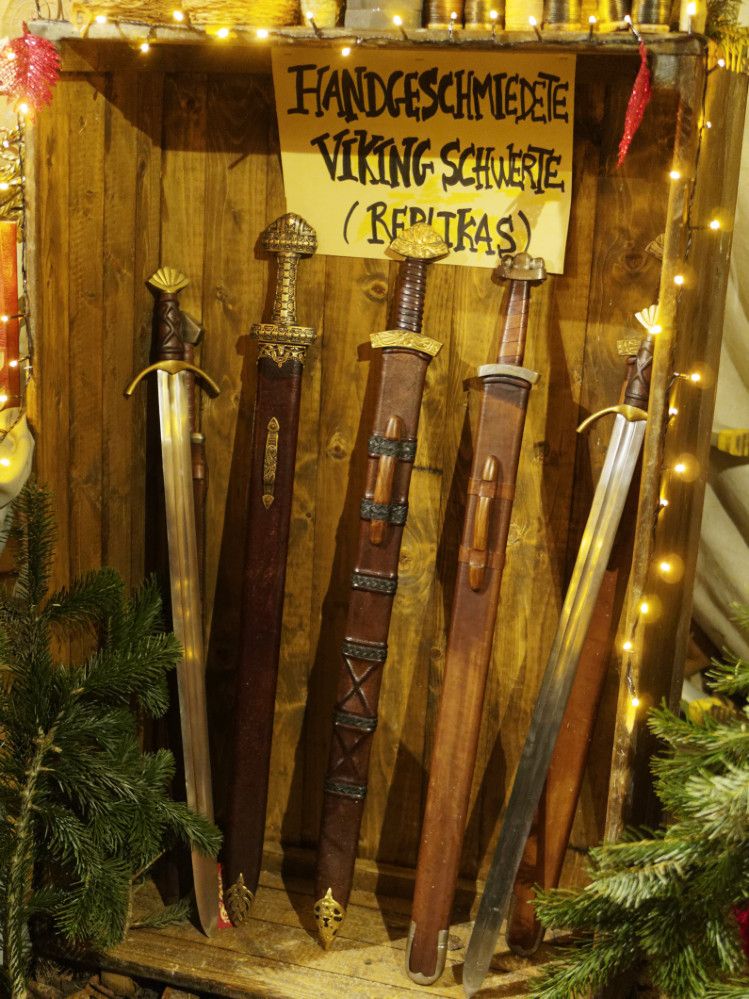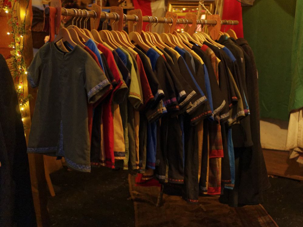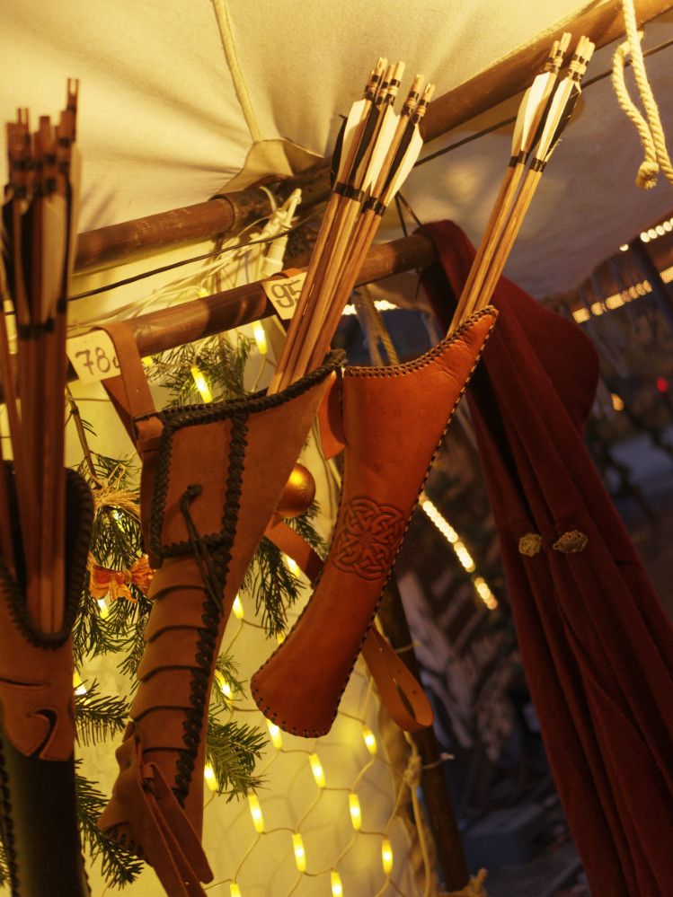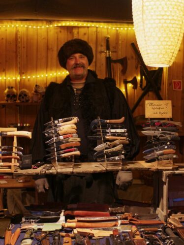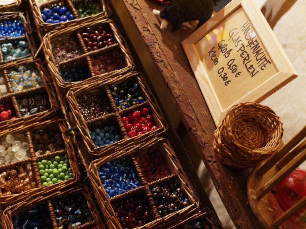 Feilgeboten wird, was das mittelalterliche und auch das träumerische Herz begehrt: Gewandungen und Kostüme aller Art, Kerzen und Öllampen, Replika-Waffen und Rüstungen, geschmiedeter Metallschmuck und handgemachte Glasperlen, farbige Flakone und Steingutbecher (Highlight: mit Nuckel!), Elfenpüppchen aus Porzellan neben Dracheneiern aus irgendeinem undefinierbaren Material. Viel Tand und Tinneff, Dinge, die der Mensch nicht braucht. Aber, das alles wird so liebevoll dekoriert und angepriesen, dass es eine wahre Lust ist, durch die Hütten und an den Ständen vorbei zu bummeln.