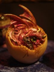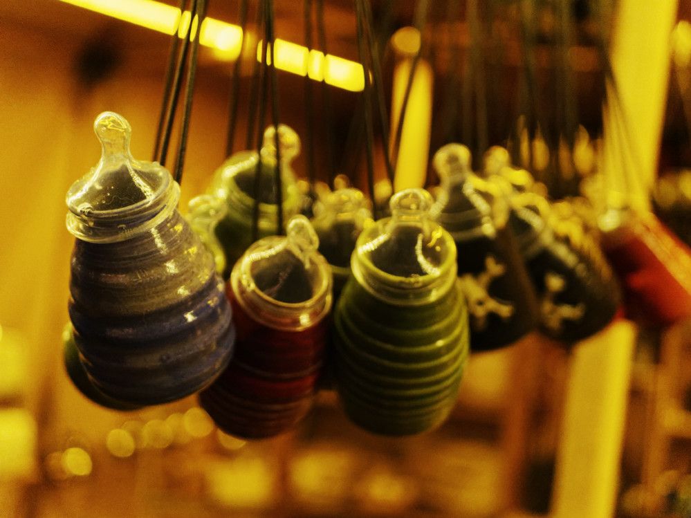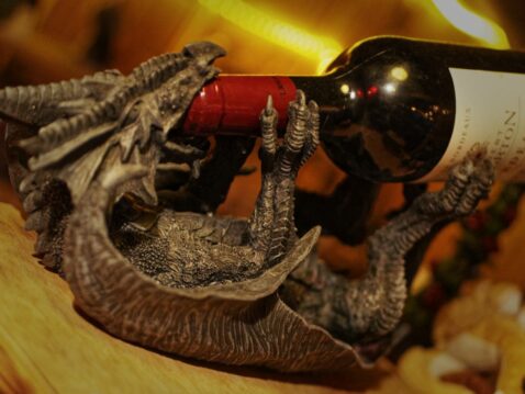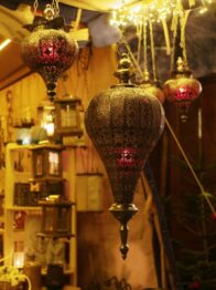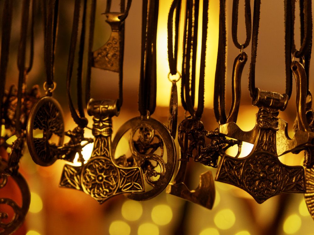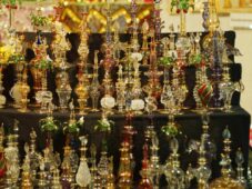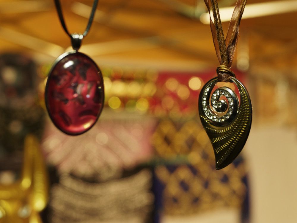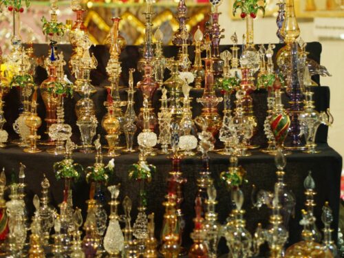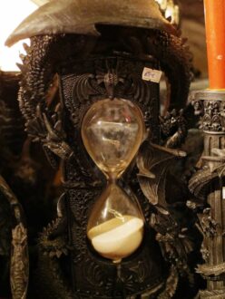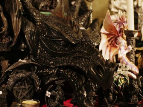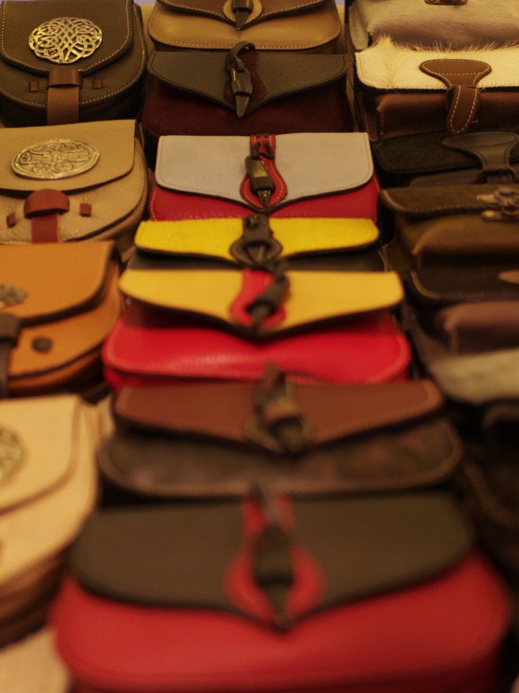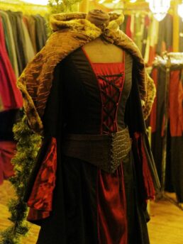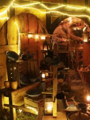 Feilgeboten wird, was das mittelalterliche und auch das träumerische Herz begehrt: Gewandungen und Kostüme aller Art, Kerzen und Öllampen, Replika-Waffen und Rüstungen, geschmiedeter Metallschmuck und handgemachte Glasperlen, farbige Flakone und Steingutbecher (Highlight: mit Nuckel!), Elfenpüppchen aus Porzellan neben Dracheneiern aus irgendeinem undefinierbaren Material. Viel Tand und Tinneff, Dinge, die der Mensch nicht braucht. Aber, das alles wird so liebevoll dekoriert und angepriesen, dass es eine wahre Lust ist, durch die Hütten und an den Ständen vorbei zu bummeln.