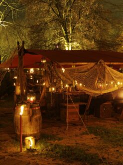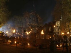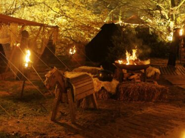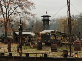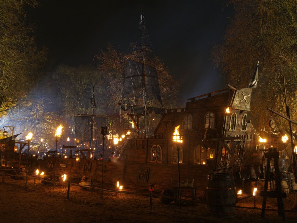 Piratenfeste mit gestrandetem Schiff und Leuchtturm, die Hinrichtungsstätte, das große Zeltdorf mit festen Wegen aus in den Boden eingelassenen Holzbohlen, das große Heerlager mit winterfesten Zelten und Gestalten in Leder und Pelz – sie alle wirken im Fackelschein wie echt und aus der Zeit gefallen.