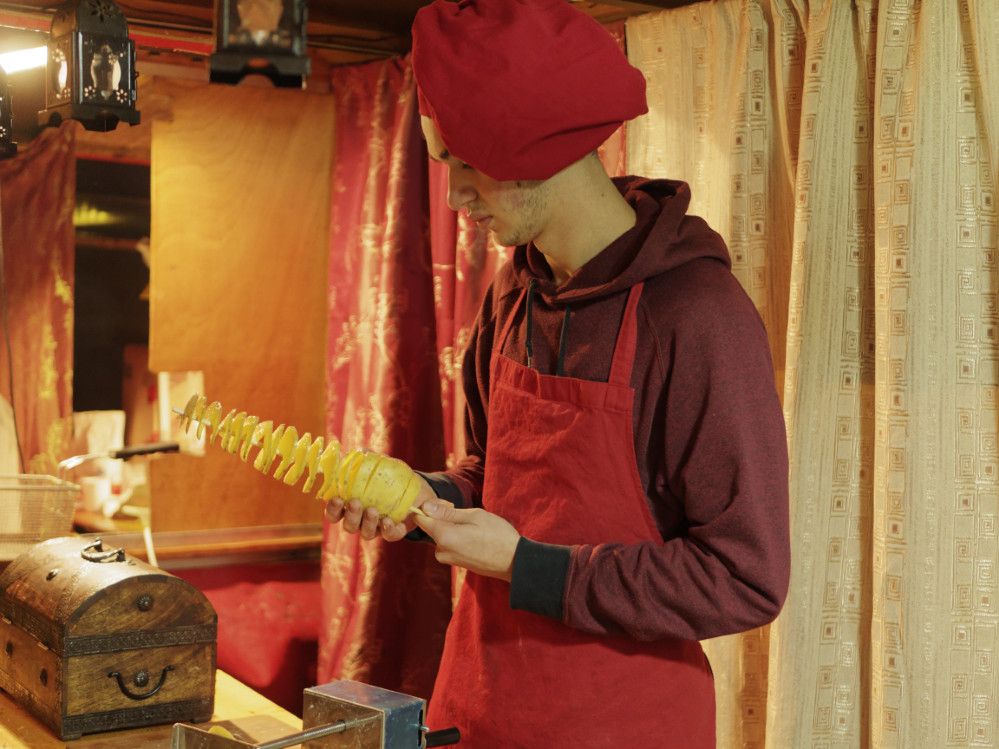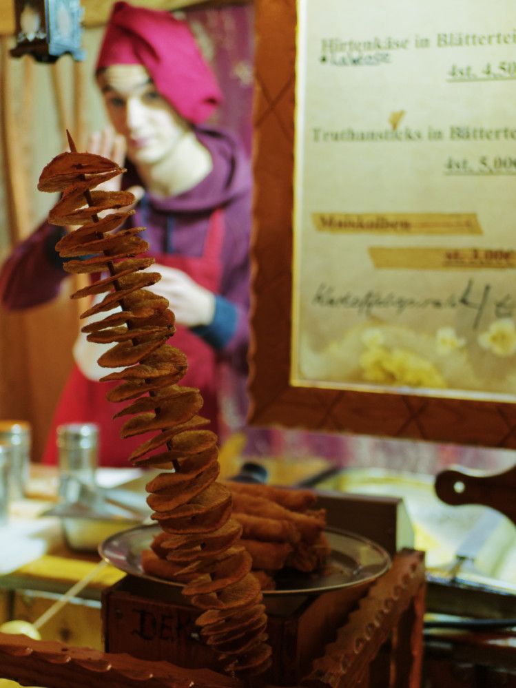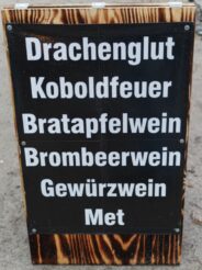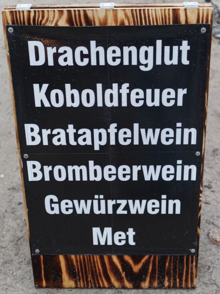 Mittelalterlich anmutende Leckereien verführen allerorten durch intensive Gerüche: Die mit Gewürzfleisch gefüllten Hanffladen lassen jeden Döner alt aussehen. Ob herzhafte Drachenspieße, gebratene Äpfel, in großen Schwenkpfannen gegarte Eintöpfe, die in einem Stück frisch frittierten Spiralkartoffeln, oder die süß bestreuten heißen Baumstriezel, hier kommt keiner zu kurz.