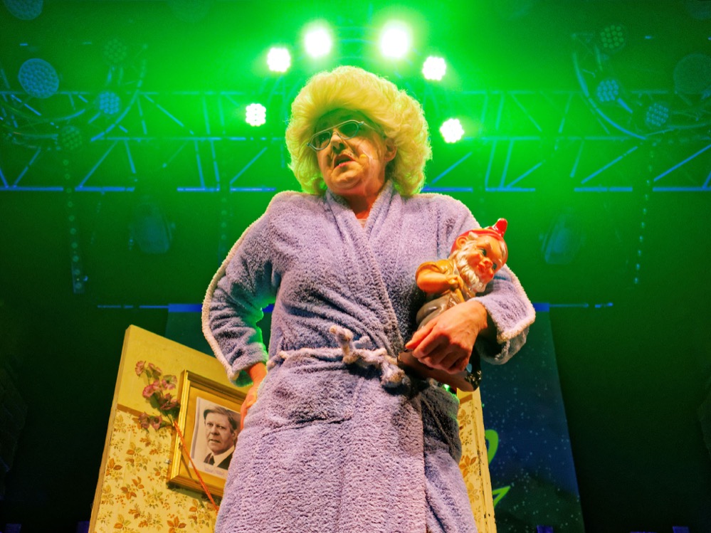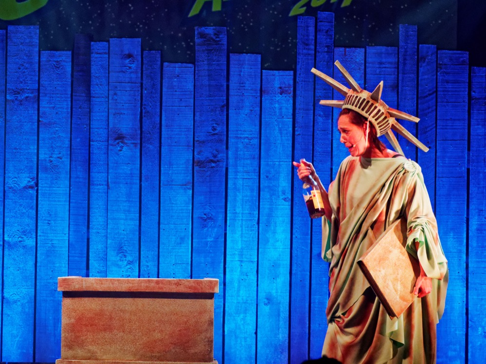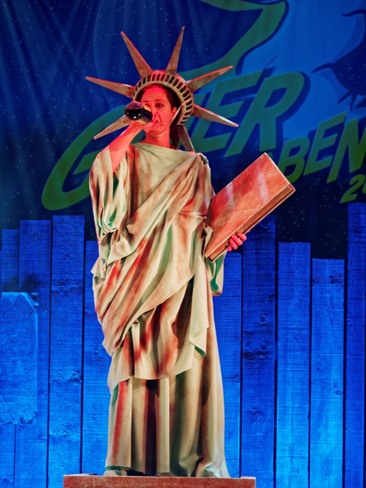 Eines der absoluten Höhepunkte des Abends ist aber sicherlich die Freiheitsstatue, die aus lauter Verzweiflung über die Präsidentschaftswahl in den USA von ihrem Sockel steigt und sich nach Kräften besäuft.