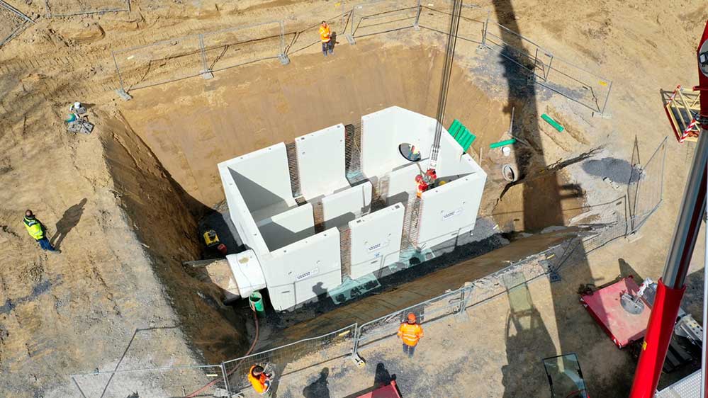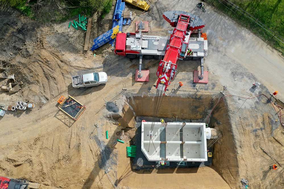 Der Regenüberlauf besteht aus individuell produzierten Fertigbauteilen, die später so dicht sein müssen, dass nicht ein einziger Tropfen Schmutzwasser ins Grundwasser entweichen kann. Bei ihrer Anlieferung schwebten die mehr als 30 Tonnen schweren Einzelstücke per Kran an die jeweils für sie vorgesehene Stelle. Bei Starkregenereignissen wird an der „Weiche Regenüberlaufbauwerk“ das sehr stark verdünnte Abwasser dem Regenrückhaltebecken zugeführt und zeitverzögert und gedrosselt in den Kirchhörder Bach eingeleitet.