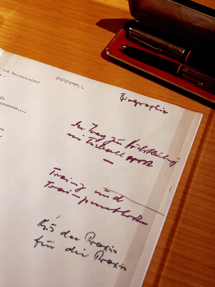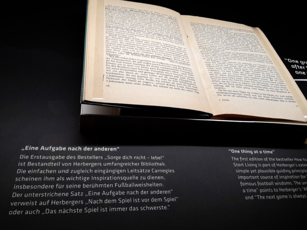 Die interessantesten Stücke aus der Bibliothek von Sepp Herberger finden sich nun eingebaut in der Sonderausstellung, ergänzt durch weitere Erinnerungen an das Leben und die Zeit des großen Trainers. So ist sein Schreibtisch zu sehen, mit einem Originalmanuskript seiner angefangenen, aber nie veröffentlichten Biographie.