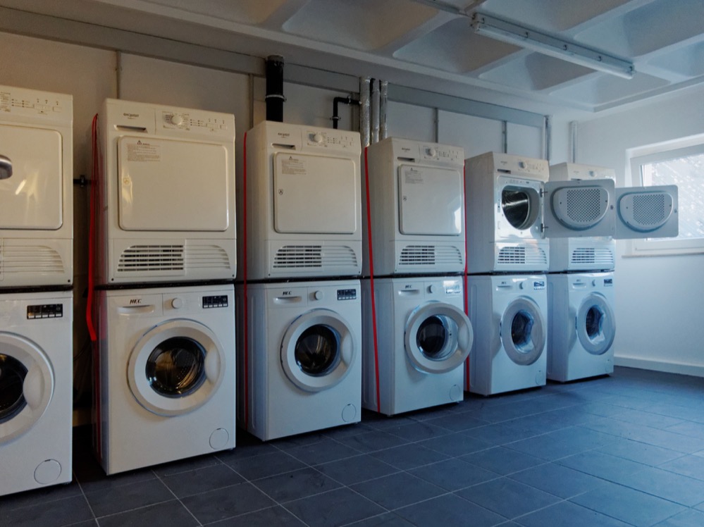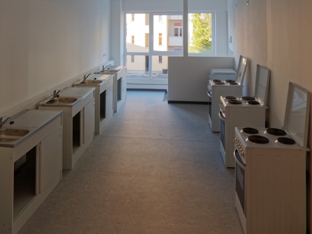 Für jeweils circa zehn Personen ist ein Herd mit Ofen und eine Spüle vorgesehen. Unterm Dach stehen einige Waschmaschinen und Trockner zur Verfügung.