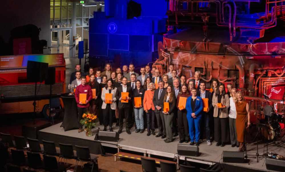 Für die besten Bachelor- und Masterarbeiten eines jeden Fachbereichs würdigte die Fördergesellschaft: Hatim Barioudi (Informationstechnik), Lars Erbach (Informatik), Lennart Grünsel (Design), Benjamin Hantke (Angewandte Sozialwissenschaften), Cedric Hentschel (Maschinenbau), Amelie Kurz (Architektur), Anna Romero Müller (Wirtschaft) und Finn Springer (Elektrotechnik). In ihren Dankesworten lobten Studierende die „persönliche und kompetente Unterstützung der Lehrenden“ an der FH Dortmund, das Engagement der Hochschule in der Region, die moderne technische Ausstattung und die offenen Labore. „Das Miteinander ist respektvoll und familiär und durch einen unterstützenden Geist geprägt“, so ein Preisträger. Die Fördergesellschaft unterstützt auch die anwendungsbezogene Lehre und Forschung und zeichnet Arbeiten aus, die Probleme lösen und Prozesse verbessern. Den Forschungspreis 2024 bekamen Prof. Dr. Martin Kiel und Prof. Dr. Stefan Kempen aus dem Fachbereich Elektrotechnik. Sie arbeiten an Energiespeichersystemen, die mit bis zu zehn Mal höherer Spannung betrieben werden, um den Verlust zu reduzieren. Auch der Preis für ausgezeichnete Lehre ging an den Fachbereich Elektrotechnik: an Prof. Dr. Simone Arnold. Die Studierenden loben ihre anschauliche Lehre insbesondere in den wichtigen Grundlagenfächern Physik I & II. Sie sei stets offen für Wünsche und Themenvorschläge und vermittle die Inhalte lebendig, digital und besonders praxisnah. „Obwohl ich doch eigentlich theoretische Physikerin bin“, scherzt die sichtlich gerührte Preisträgerin auf der Bühne der Akademischen Jahresfeier 2024. Weitere Preisträger*innen des Abends sind: Preis der Fördergesellschaft für herausragende kooperative Promotion: