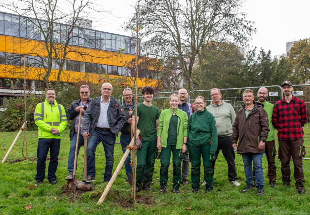 Gärtner*innen vom Botanischen Garten Rombergpark haben auf der ehemaligen „Hörsaalzelt-Wiese“ auf dem Campus Nord rund 30 junge Apfelbäume gepflanzt. Sie sollen in Zukunft einen neuen Lebensraum und Nahrungsquellen für Insekten und Vögel direkt auf dem Campus zwischen Vogelpothsweg und Emil-Figge-Straße bieten. Mitten in der Corona-Pandemie standen noch zwei große Zelte auf der Wiese vor der Mensa, um gut gelüftete Lernplätze auf dem Campus zu schaffen. Einige Jahre zuvor hatte die Universität dort bereits ein großes Hörsaalzelt aufstellen müssen, um für den doppelten Abiturjahrgang NRW Vorlesungen abhalten zu können. Da inzwischen ausreichend Platz in den Gebäuden vorhanden ist und die Zahl der Studierenden voraussichtlich auch nicht weiter steigen wird, soll die Wiese wieder als Grünfläche genutzt werden: Die Bepflanzung mit Obstgehölz soll die Biodiversität auf dem Campus fördern, neuen Lebensraum für Bienen bieten und die Luftqualität verbessern. Gleichzeitig schafft sie Raum für Erholung zwischen den Vorlesungen und stärkt das Bewusstsein für Nachhaltigkeit.