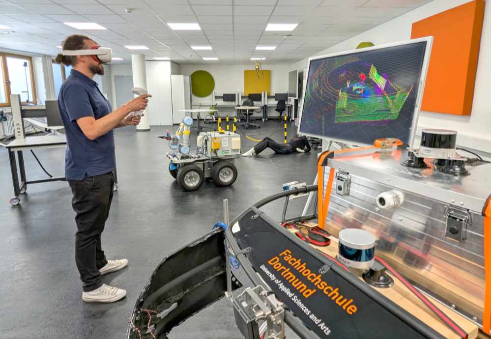 Wo früher Spaghetti und Pommes vertilgt wurden, cruisen nun Roboter, tasten Laser die Umgebung ab und tauchen Studierende in virtuelle Welten ein . Die Fachhochschule Dortmund nutzt das „BitLab“ als neue Experimentierfläche für Virtual und Augmented Reality, intelligente Mobilität und Robotik. Dafür wurde ein ehemaliger Mensa-Bereich am Campus Sonnenstraße für den Fachbereich Informationstechnik neu hergerichtet. 170 Quadratmeter Fläche, komplett modular bespielbar, ausgelegt mit einem schwarzen Belag, der sonst in Werkshallen verbaut wird. „Wir waren auf der Suche nach etwas Robustem, das optisch und in der Oberflächenstruktur dem klassischen Asphalt auf der Straße ähnelt“, erklärt Steffen Baumann. Er und sein Kollege Tobias Uhlich sind wissenschaftliche Mitarbeiter am Fachbereich Informationstechnik und haben das „BitLab“ mit konzipiert. Auf dem Asphalt-ähnlichen Untergrund fahren nun verschiedenste Roboter, werden Sensoren für autonomes Fahren getestet.