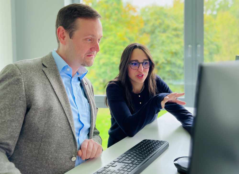 Auf dem Bild: Aya Rbib und Brockhaus-Vorstand Matthias Besenfelder im Austausch über die Jahresplanung. Beim „Boss-Day“ hat die FH-Studentin für einen Tag den Chefposten des Lüner IT-Spezialisten übernommen.