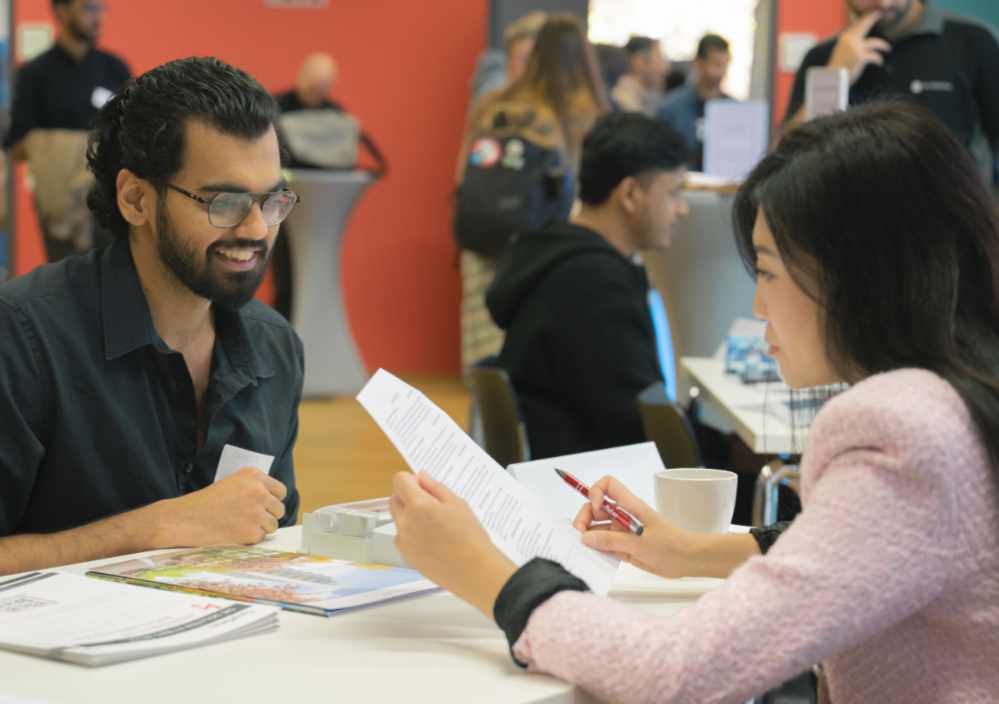 Vom traditionsreichen Industriekonzern bis zum jungen Start-up: Rund 30 Firmen mit Sitz in Dortmund oder der Region haben die 13. Internationale Karrieremesse der TU Dortmund genutzt, um sich Studierenden zu präsentieren und sie in Recruiting-Gesprächen persönlich kennenzulernen. Gemeinsam mit der Industrie- und Handelskammer (IHK) zu Dortmund unterstützt die Universität mit dem kürzlich ausgezeichneten Projekt internationale Studierende auf dem Weg in den deutschen Arbeitsmarkt und hilft regionalen Unternehmen bei der Suche nach qualifizierten Fachkräften. Im Vorfeld der Messe hatten mehr als 540 internationale Studierende die Möglichkeit genutzt, über die App „Talentefinder“ mit den ausstellenden Unternehmen in Kontakt zu kommen. So konnten beide Seiten nach potenziellen „Matches“ suchen, sich bilateral kennenlernen und Termine für den Messetag vereinbaren. Auch bei spontanen Besuchen konnten Studierende mit den Firmenvertreter*innen ins Gespräch kommen. Insgesamt besuchten in diesem Jahr sogar fast doppelt so viele Studierende wie im Vorjahr die Internationale Karrieremesse, um sich zu informieren und den Unternehmen vorzustellen.