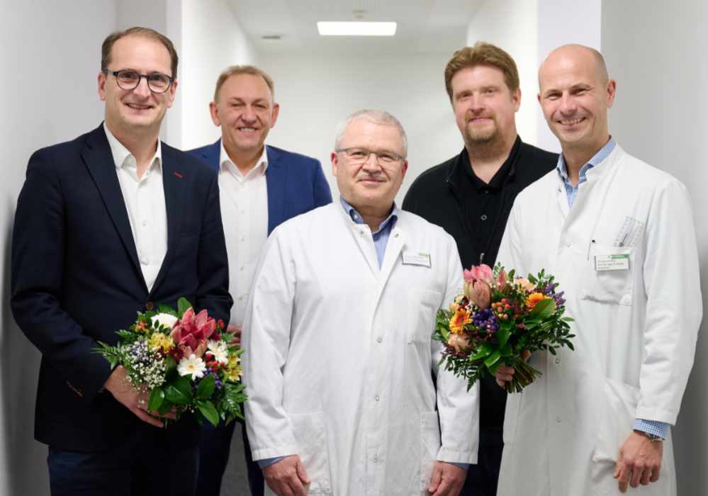 Auf demBild zu sehen: Prof. Dr. Stefan Rohde (l.) und Prof. Dr. Christian Lüring (r.) wurden auf Lehrstühle der Universität Witten/Herdecke berufen. Die Geschäftsführung gratulierte: (v.l.) Peter Hutmacher, Prof. Dr. Dr. Stefan Haßfeld und Arbeitsdirektor Michael Kötzing.
