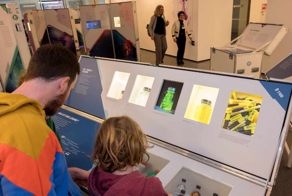 Eine Expedition in die Welt der naturwissenschaftlichen Forschung können Besucher*innen in der Ausstellung „Völlig losgelöst“ erleben. Sie erhalten Einblicke in die Spitzenforschung des gemeinsamen Exzellenzclusters „RESOLV – Ruhr Explores Solvation“ der TU Dortmund und der Ruhr-Universität Bochum zur Rolle von Lösungsmitteln. Die Ausstellung ist noch bis zum 19. Januar auf dem Campus Stadt im Dortmunder U zu sehen. Was hat das Rosten einer Stahloberfläche mit der Kälteresistenz eines Polardorsches gemeinsam? Beide Phänomene hängen eng mit Vorgängen zusammen, die in Flüssigkeiten stattfinden. An Beispielen wie der chemischen Verbindung Uranin, die in Wasser gelöst gelbgrün fluoresziert und zum Beispiel in Textmarkern zum Einsatz kommt, erklärt die Ausstellung visuell beeindruckend, was die Naturwissenschaft allgemein und die Erforschung von Lösungen speziell zu einem Erlebnis macht. Angebote zum gemeinsamen Experimentieren für Schulklassen begleiten die Präsentation. Feierlich eröffnet wurde die Ausstellung durch Prof. Manfred Bayer, Rektor der TU Dortmund, Prof. Barbara Welzel, wissenschaftliche Leiterin des Campus Stadt, Prof. Martina Havenith, Sprecherin von RESOLV, Dr. Christian Strippel, der die Ausstellung konzipiert hat, und Prof. Insa Melle, Leiterin des Lehrstuhls für Didaktik der Chemie an der TU Dortmund. Die Veranstaltung fand im Rahmen des Familiensonntags statt, bei dem ein Experimentierprogramm Kindern die Möglichkeit bot, in die Rolle von Forscher*innen zu schlüpfen und die Welt der Lösungsmittel zu erkunden. Am Eröffnungstag haben rund 500 Personen die Ausstellung besucht.