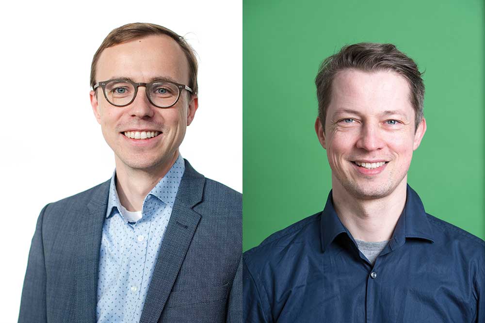 Bildzeile: Der katholische Theologe Jun.Prof. Alexander Unser (l.) und der Politikwissenschaftler Jun.Prof. Matthias Kortmann forschen gemeinsam zum Zusammenhalt in Europa.