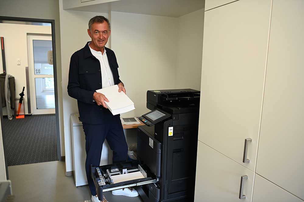 Bildzeile: Kanzler Jochen Drescher setzt für die Fachhochschule Dortmund verstärkt auf Recyclingpapier.