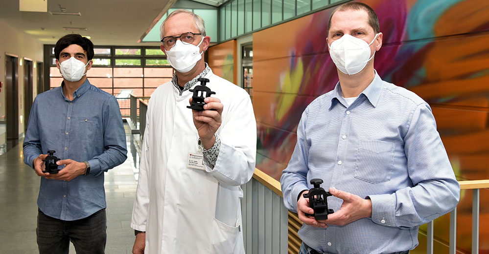 Bildzeile: Die Erfinder (v. l. ) Jan Wüst, Dr. Dirk Buchwald, Markus Bongert mit ihrer besonderen Schlauchklemme.