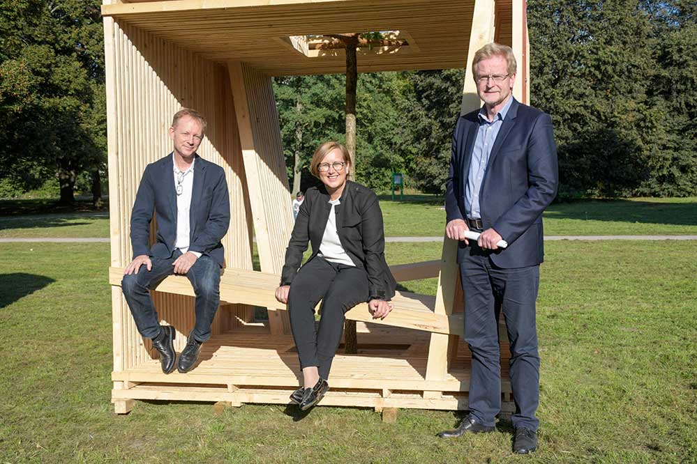 Bildzeile: Wissenschaftsministerin Isabel Pfeiffer-Poensgen mit den Rektoren Prof. Ulrich Radtke (UDE), Prof. Manfred Bayer (TU Dortmund) und Prof. Axel Schölmerich (RUB).