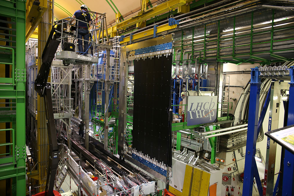 Bildzeile: Der neue Detektor am LHCb-Experiment – schwarzer Block – wurde von Physiker*innen der TU Dortmund mitentwickelt und gebaut.
