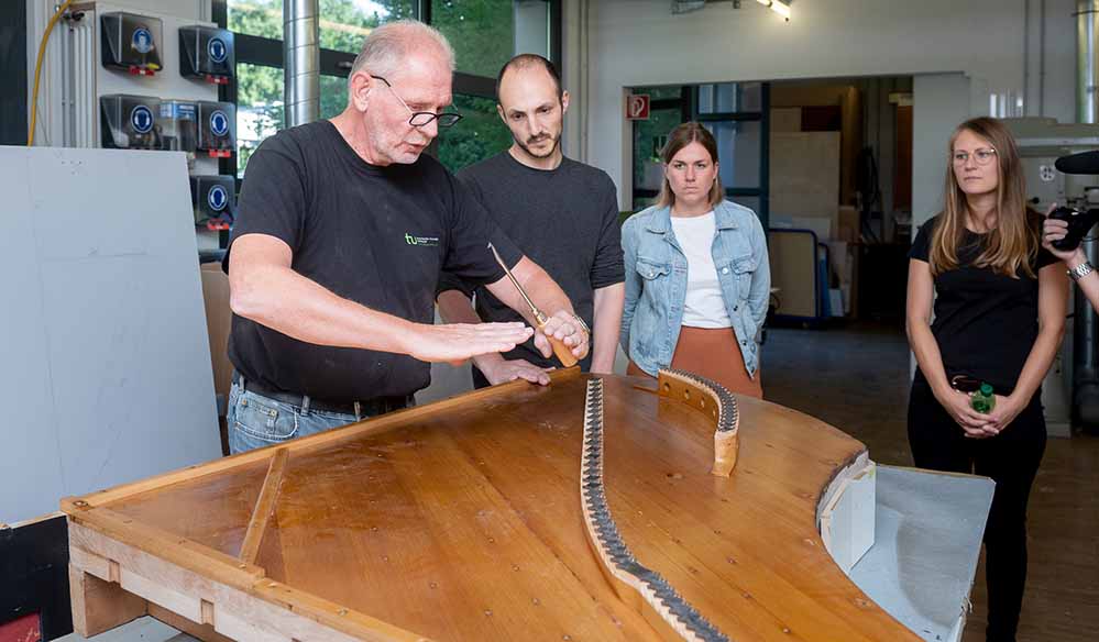 In der Modellbauwerkstatt am Campus Süd der TU Dortmund hat sich eine Handvoll Studierender versammelt. Sie stehen um einen Resonanzboden eines Konzertflügels versammelt, der mit seinem Gussrahmen aus massivem Metall auf einer Arbeitsfläche in dem Raum liegt, und hören Dirk von Kölln zu. Der Leiter der Modellbauwerkstatt erklärt ihnen gerade, wie sie einen Riss im Holz des Resonanzbodens mithilfe eines Keils und Fischleim reparieren können. „Das Ausspaneisen wird eingesetzt und nach vorne geschoben, sodass sich der Riss erstmal vertieft. In diesen Riss wird der Keil eingeleimt und reingeschlagen. Danach wird der Keil beigearbeitet, und durch ausgeübten Druck schließt sich der Riss im Resonanzboden wieder.“