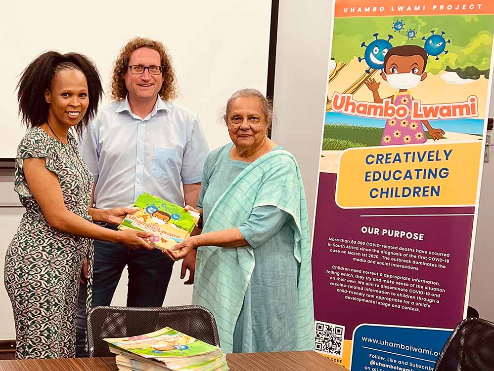 Dr. Maud Mthembu (l.) von der University of KwaZulu-Natal und Sozialwissenschaftler Prof. Dr. Michael Boecker von der FH Dortmund übergeben Ela Gandhi (r.) das Corona-Malbuch.