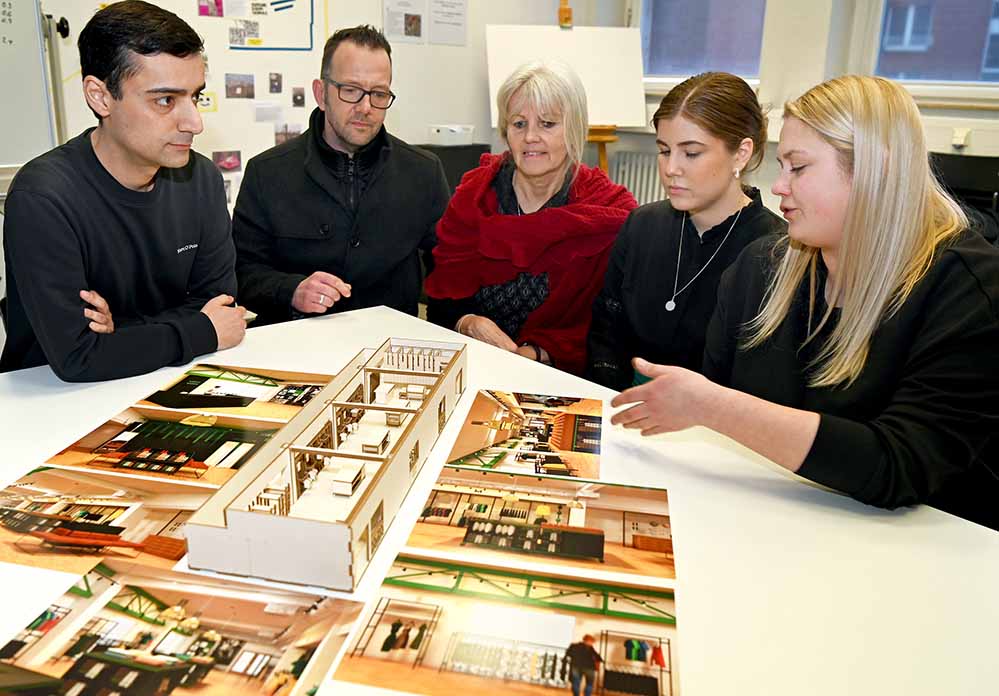Von links: Ayhan Kaya, Dirk Lünenschloß und Claudia Wiemann (alle HAZ) lassen sich den Entwurf für den neuen Look des Sozialkaufhauses von den FH-Studentinnen Alisha Leifers und Laura Stulgyte erklären.