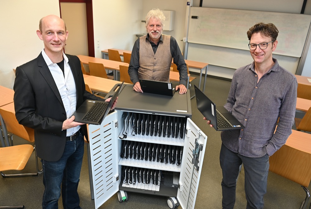 Das Projektteam (v.l.) Prof. Dr. Lutz Niehüser, Prof. Dr. Ralf Beck. Und Prof. Dr. Marcel Hoffmann stehen vor einem der fünf Laptopschränke mit Ladefunktion
