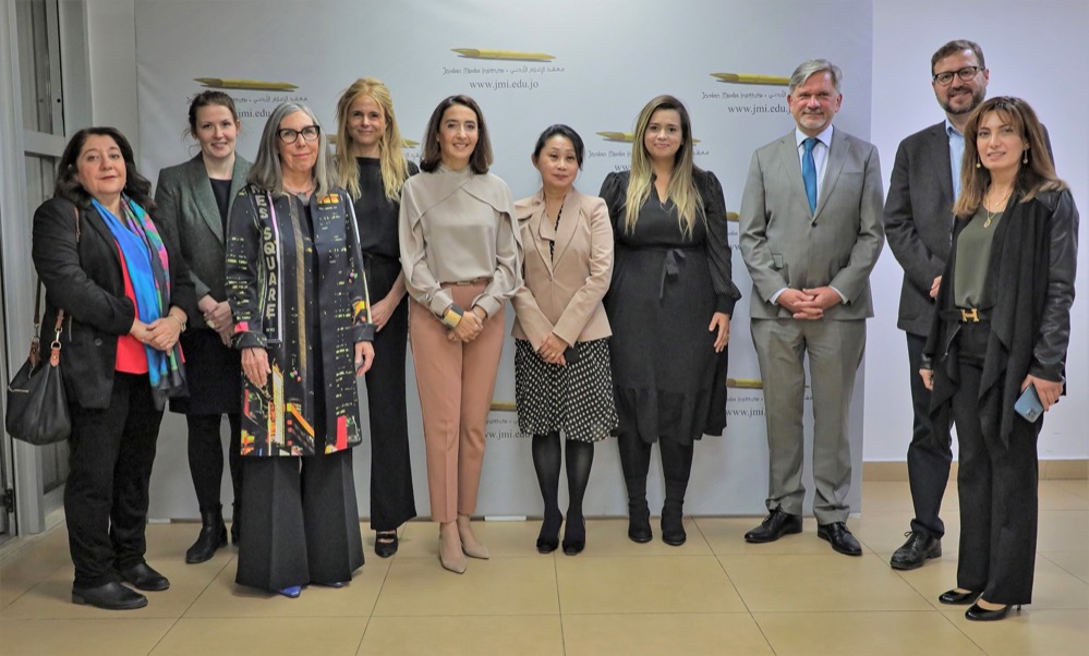 Bildhinweis: Kamen zur Veröffentlichung des Handbuchs in Amman, Jordanien, zusammen (v.l.n.r.): Jane Arraf (New York Times, Bagdad), Leonie Lorenz (Deutsche Botschaft Jordanien), Monika Lengauer und Prof. Susanne Fengler (beide TU Dortmund), Prinzessin Rym Ali von Jordanien (Gründerin des JMI), Min Jeong Kim (UNESCO), Fatma Louati (Übersetzerin des Handbuchs), Dominik Bartsch (UNHCR), Olaf Becker (UNRWA) und Mirna Abou Zeid (JMI).