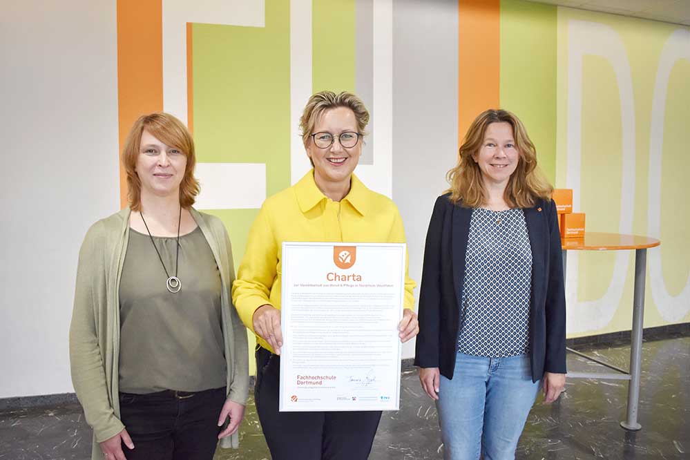 Bildzeile: Orientieren sich an der Charta für die „Vereinbarkeit von Beruf & Pflege in Nordrhein-Westfalen“ v.l. Pflegeberaterin Sonja Wentzel, FH-Rektorin Tamara Appel und Gleichstellungsbeauftragte Sonja Hunscha.