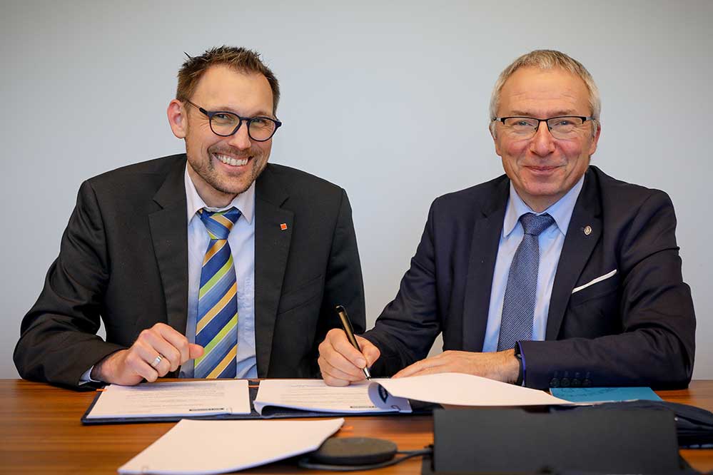 Bildzeile: Unterzeichneten das Doppelabschluss-Abkommen: Prof. Dr. Stephan Weyers (links), Prorektor für Lehre und Studium an der Fachhochschule Dortmund, und Prof. Dr. Bert Lauwers, Dekan der Faculty of Engineering Technology an der KU Leuven.