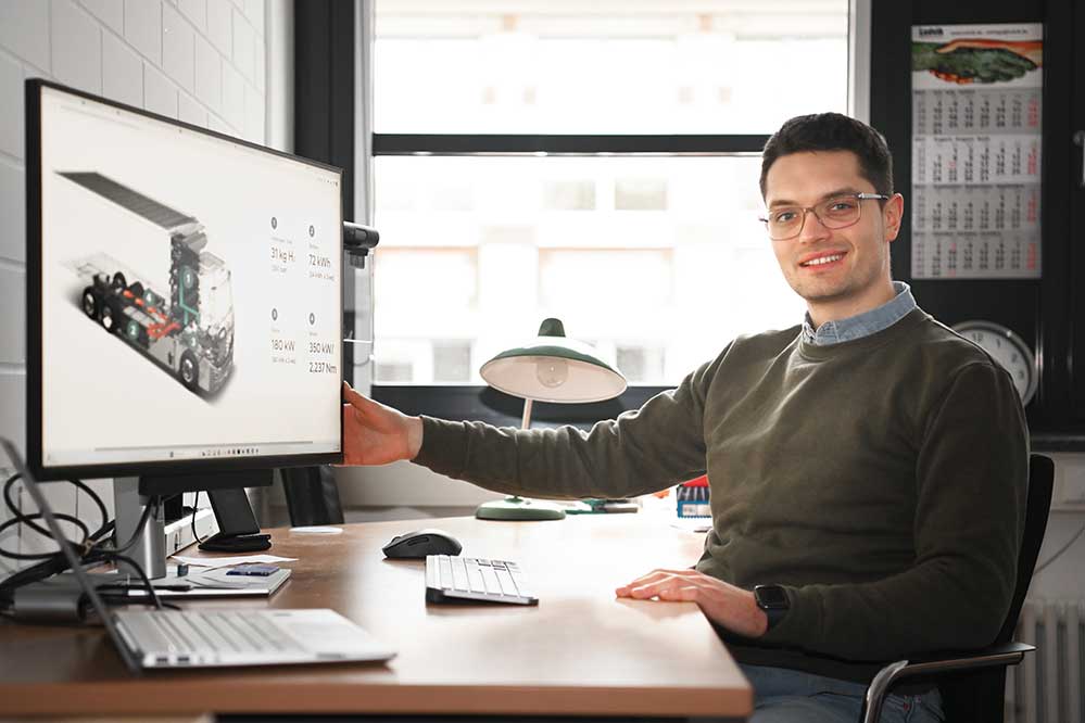 Bildzeile: Maschinenbaustudent Felix Smyrek hat einen Brennstoffzellenantrieb für LKW untersucht.