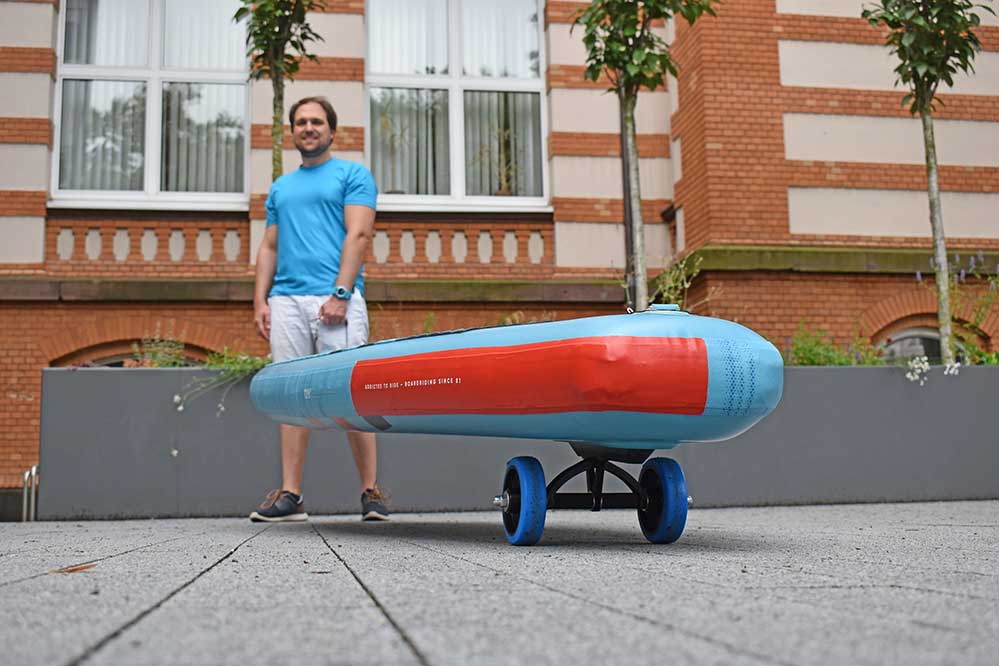 Bildzeile: Einfache Lösung zum Ziehen: Maschinenbau-Student Sebastian Reiter transportiert sein Board für das Stand-Up-Paddling auf Rollen.