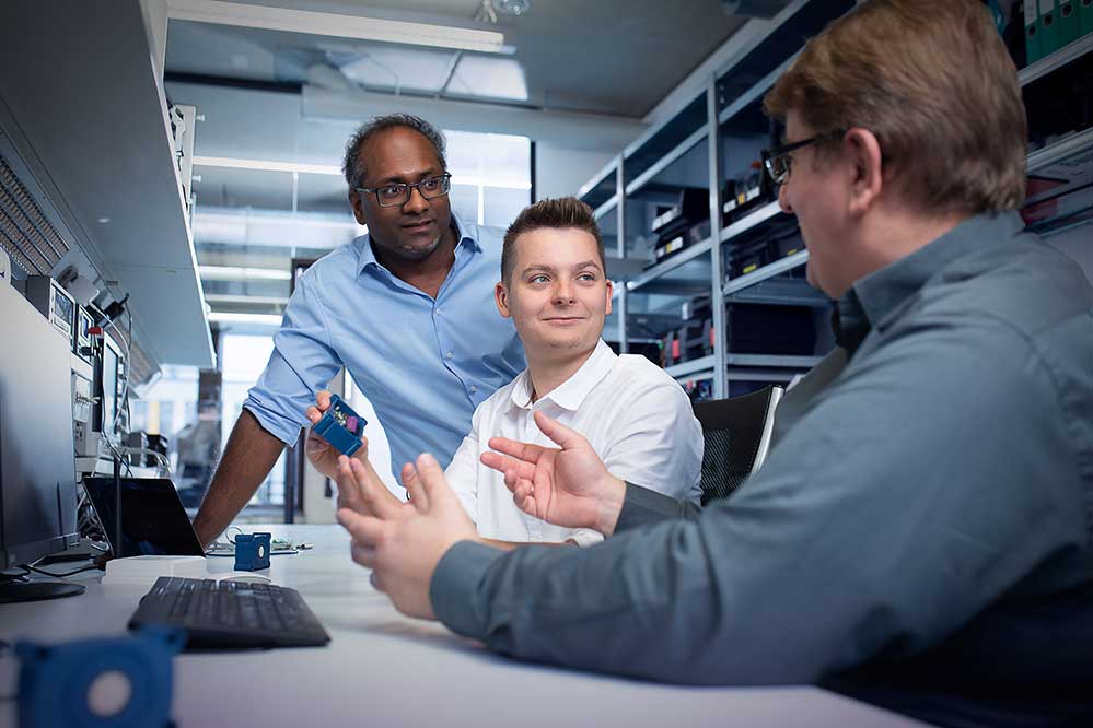 Bildzeile: microsonic Ingenieure bei der Sensorentwicklung.