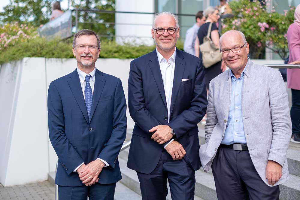 Bildzeile: v.l. Ehrendoktor Craig Crews mit Honorarprofessor Michael Beck und Professor Herbert Waldmann.