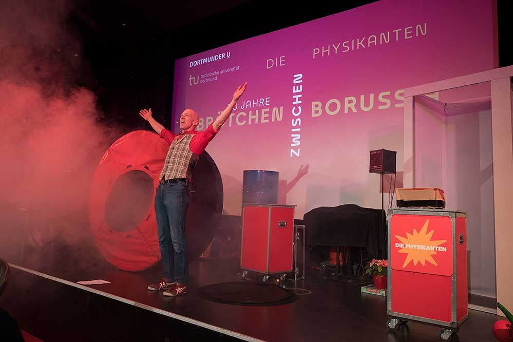 Nach den Begrüßungsworten eröffnete Marcus Weber, der die „Physikanten & Co.“ im Jahr 2000 nach seinem Studium an der damaligen Universität Dortmund gegründet hatte, seine Wissenschaftsshow im Kino des Dortmunder U. Dabei stellte er Versuche zur Schau, die er bereits in der Fernsehsendung „Wer weiß denn sowas?“ (ARD) präsentiert hat, bei der er regelmäßig zu Gast ist. Weber forderte das Publikum zum Mitexperimentieren auf und erklärte spielerisch, wie die physikalischen Abläufe funktionieren. Er begeisterte das bunt gemischte Publikum unter anderen mit einem implodierenden Fass sowie Wirbelringen aus Rauch und Seifenblasen.